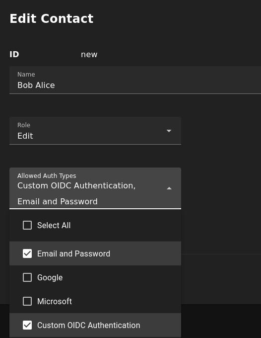 Now, configure your NodePing user to sign in with custom OIDC. In NodePing’s webapp, go to Contacts -> List Contacts. Edit the contact you want to permit OIDC authentication with by selecting “Custom OIDC Authentication” as an allowed auth type and save the contact. This option will only be present for those who have a Premiere account. This NodePing contact will need the same email address that corresponds with the email address of the Entra user.