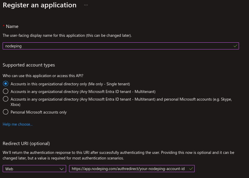 Set the Redirect URI https://app.nodeping.com/authredirect/<your-nodeping-account-id> and select Web from the dropdown menu.