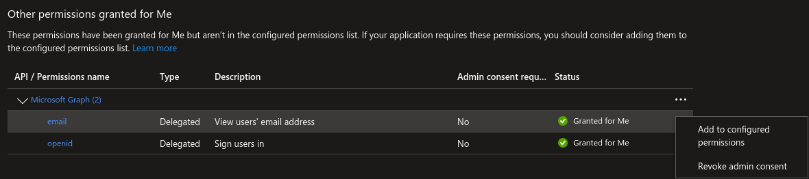 Afterwards, go to “API permissions” and go down to the “Other permissions granted for” section. You should see a Microsoft Graph Permissions name labeled “email”. Click the 3 dot menu and choose “Add to configured permissions”.