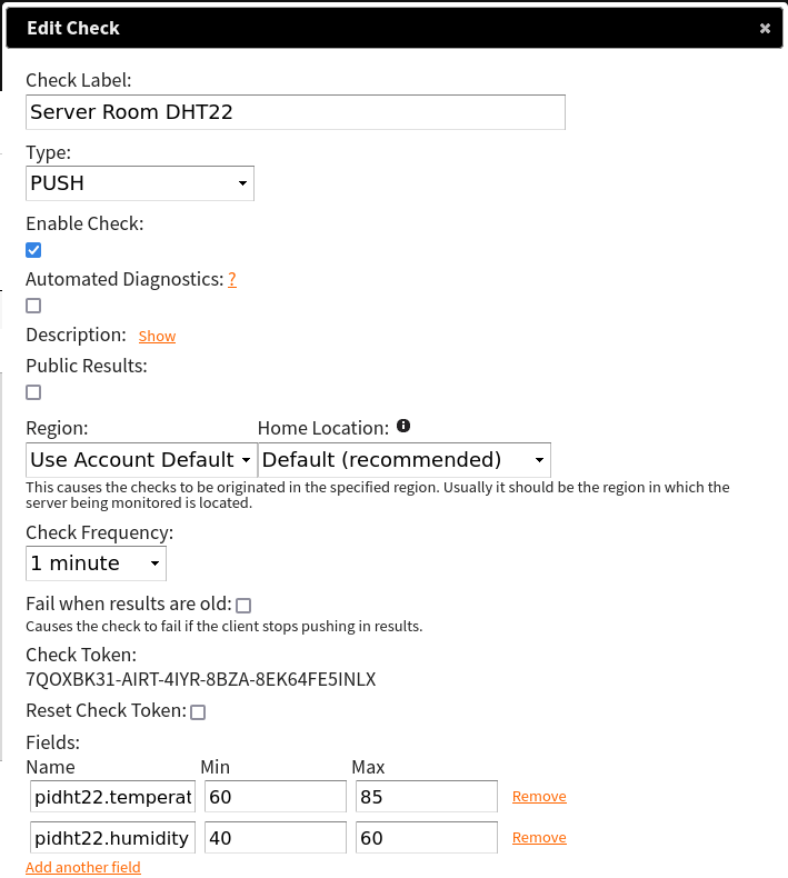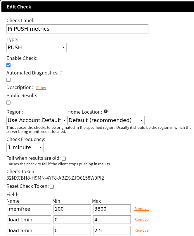First, I’m going to create the check for my cron job monitor. I set a label that is easy for me to recognize, set the check type to PUSH. I have a single field I will call “backups” with min/max values of 0 and I also set the check frequency to one day, since this is a daily backup. I set my min/max values to 0 since my backup program returns an exit code of 0 on successful backup, and anything else is some sort of failure. NodePing will see the 0 and mark the check as passing, or if my backup program returns something other than 0, NodePing will mark the check as failing and send me notifications.